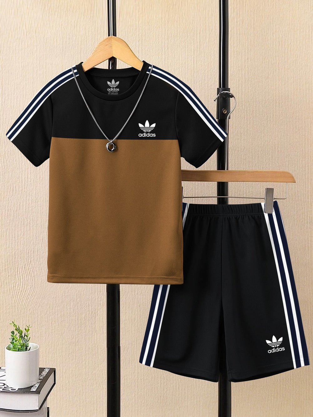 Ads Summer T Shirt & Short Suit For Kids-Golden with Black & White, Navy Stripe-BE3276/BR15714