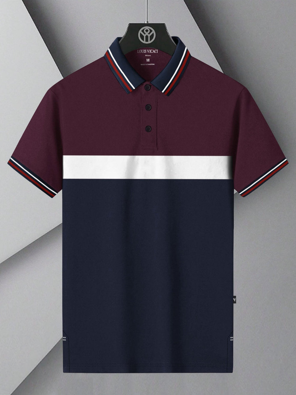 LV Summer Single Jersey Polo Shirt For Men-Maroon with White & Navy Panels-BE1836/BR14011