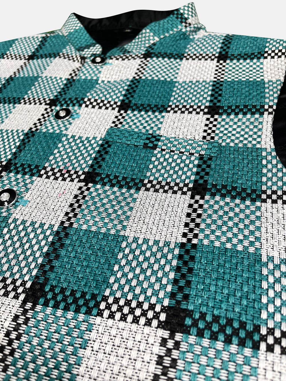 Elevate your traditional and semi-formal look with this stylish men’s waistcoat featuring a bold checkered design. Tailored with a sleeveless cut and a classic band collar, this waistcoat combines elegance with modern flair.