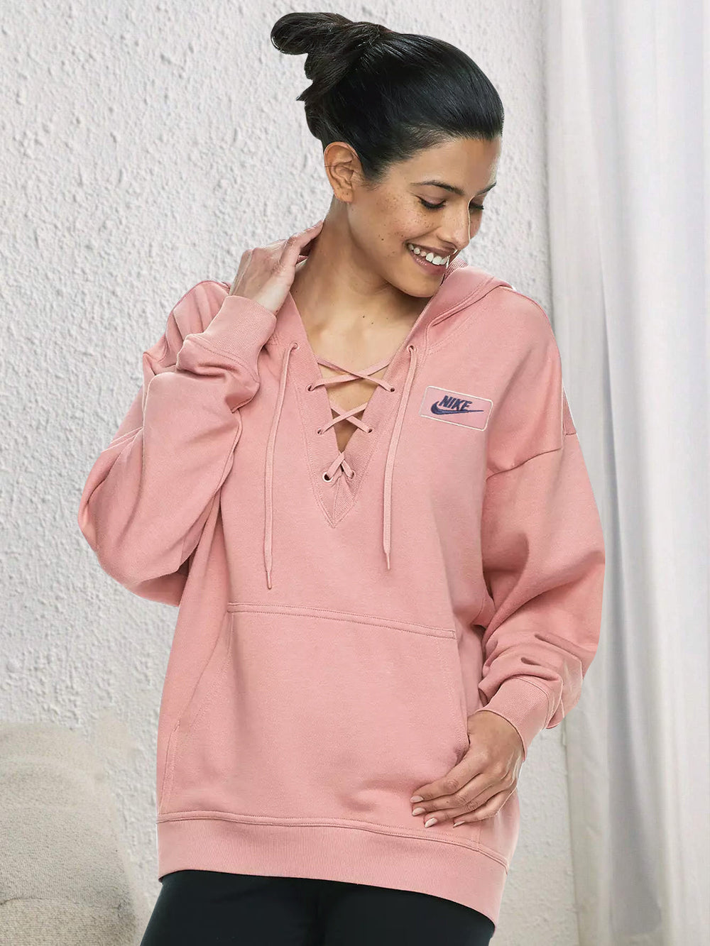 NK Terry Fleece Lace Up Hoodie For Ladies-Light Pink-RT903