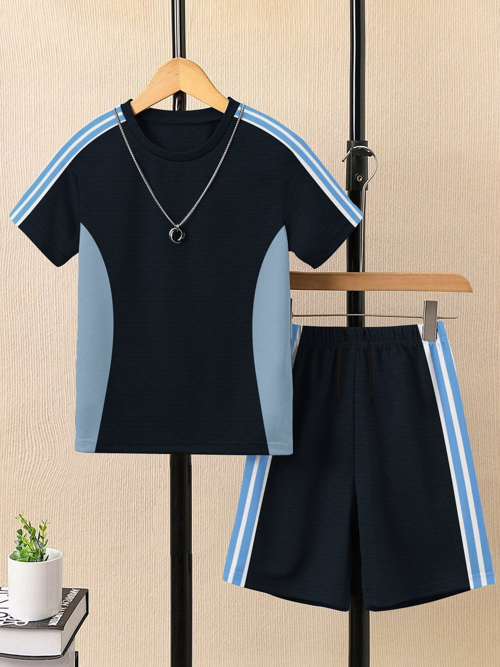 Summer T Shirt & Short Suit For Kids-Navy with Sky & Navy, White Stripe-BE3306/BR15744