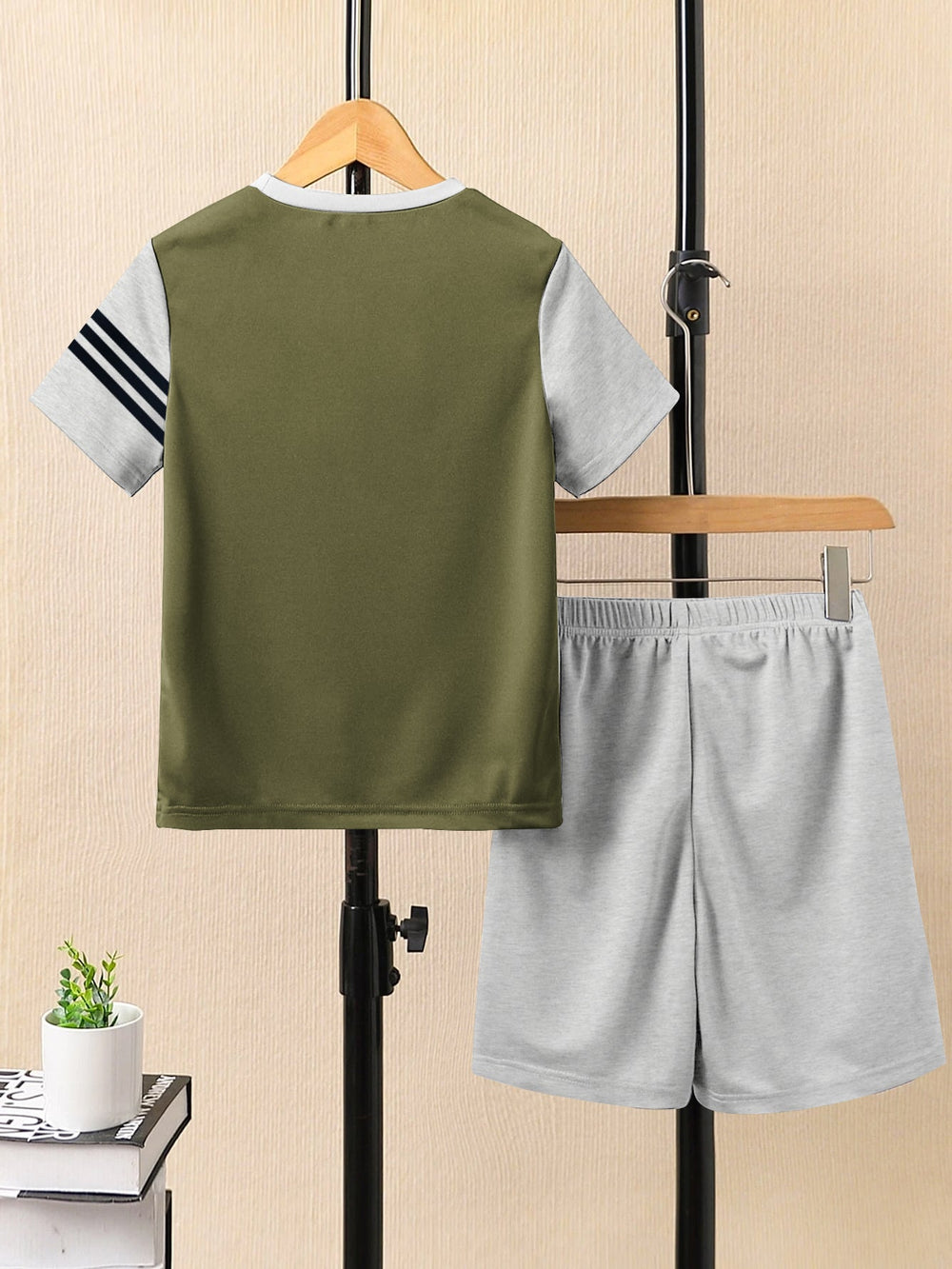 Summer T Shirt & Short Suit For Kids-Olive Green with Grey Melange & Navy Stripe-BE3305/BR15743